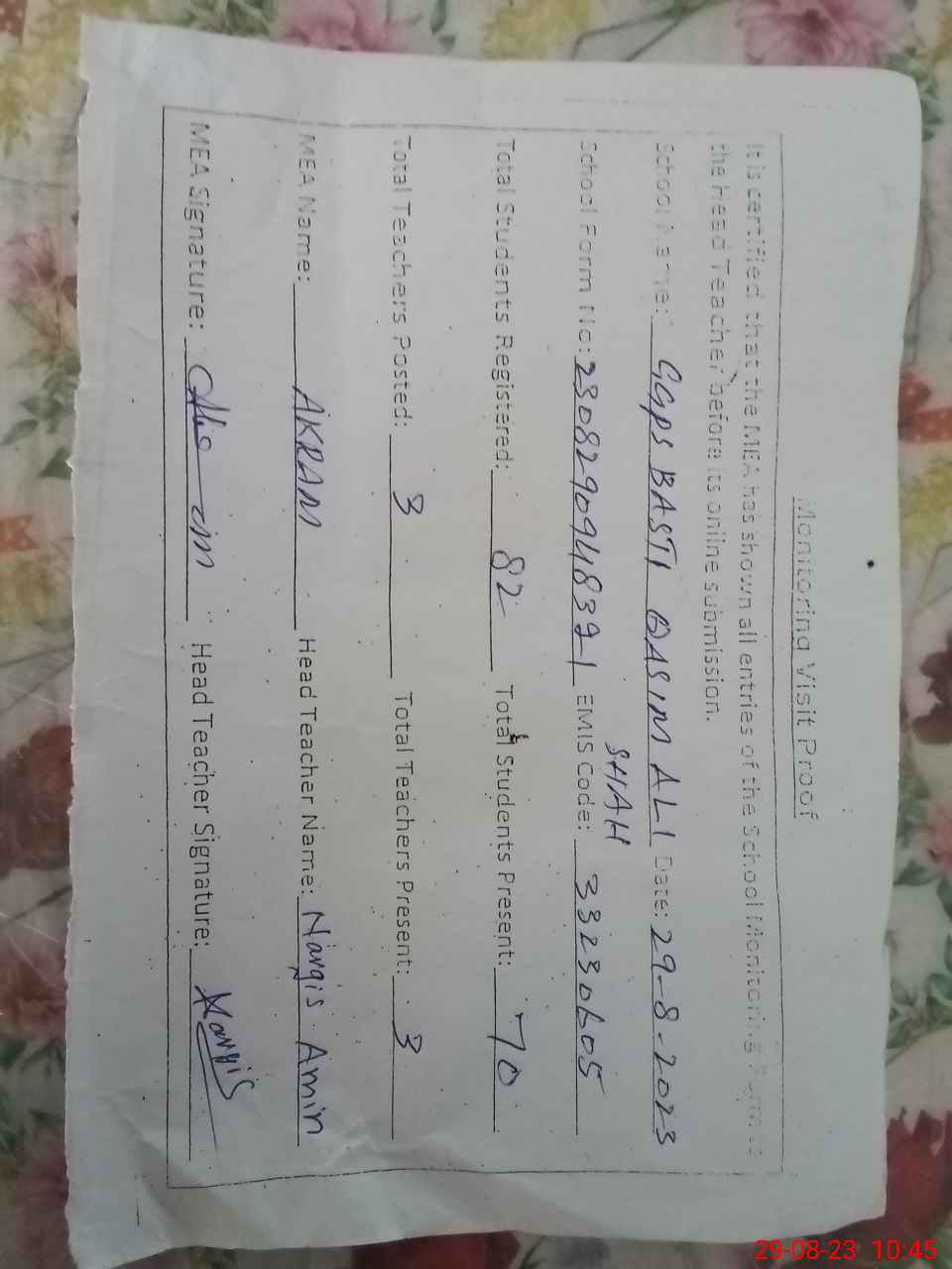 | Attendance Register | Head Teacher | MEA with School | Visit Proof |