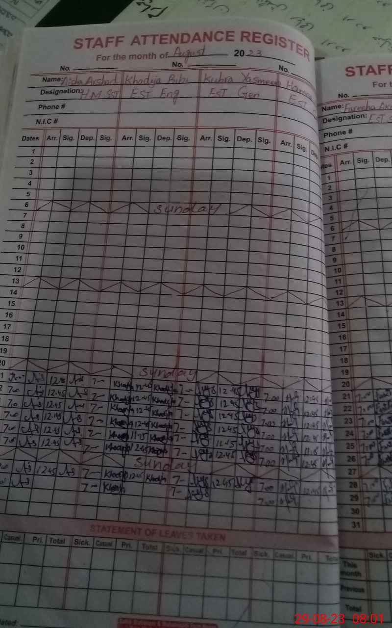 | CNIC | Full Name | Designation | R/C | Absence During Last Calender Month |