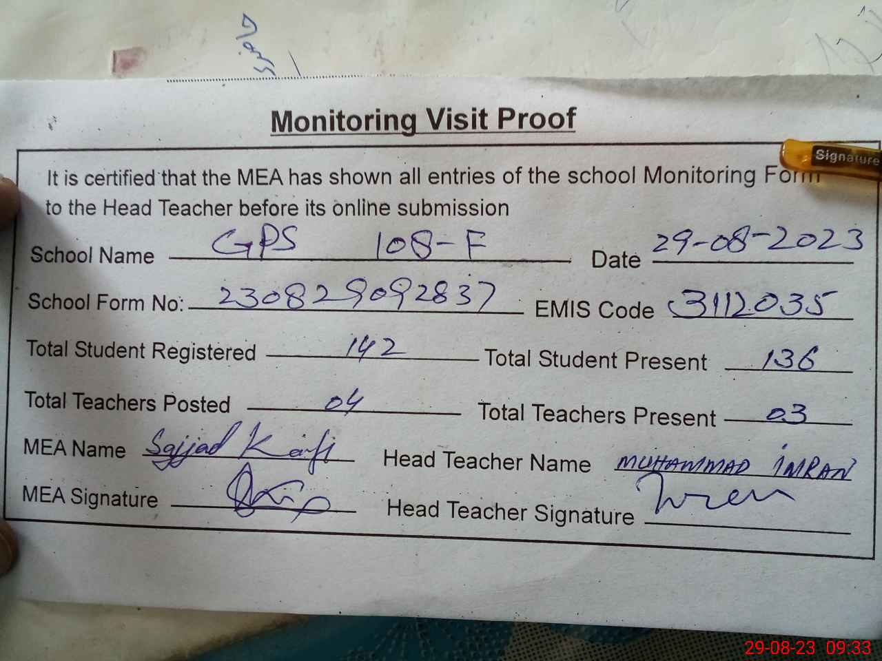 | EMIS Code: 31120354 | Name of School: GPS CHAK NO 108 F | |||