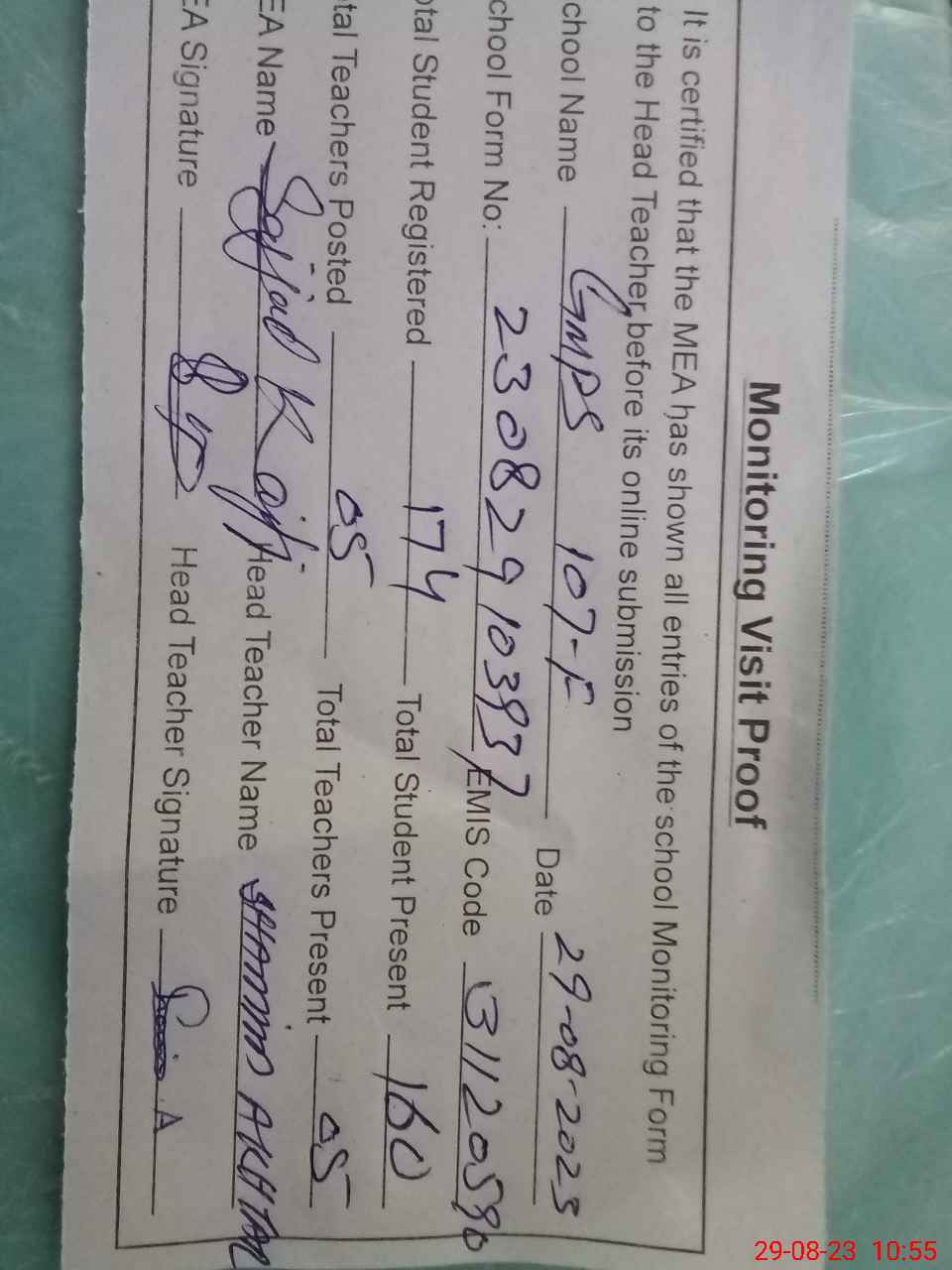 | Attendance Register | Head Teacher | MEA with School | Visit Proof |