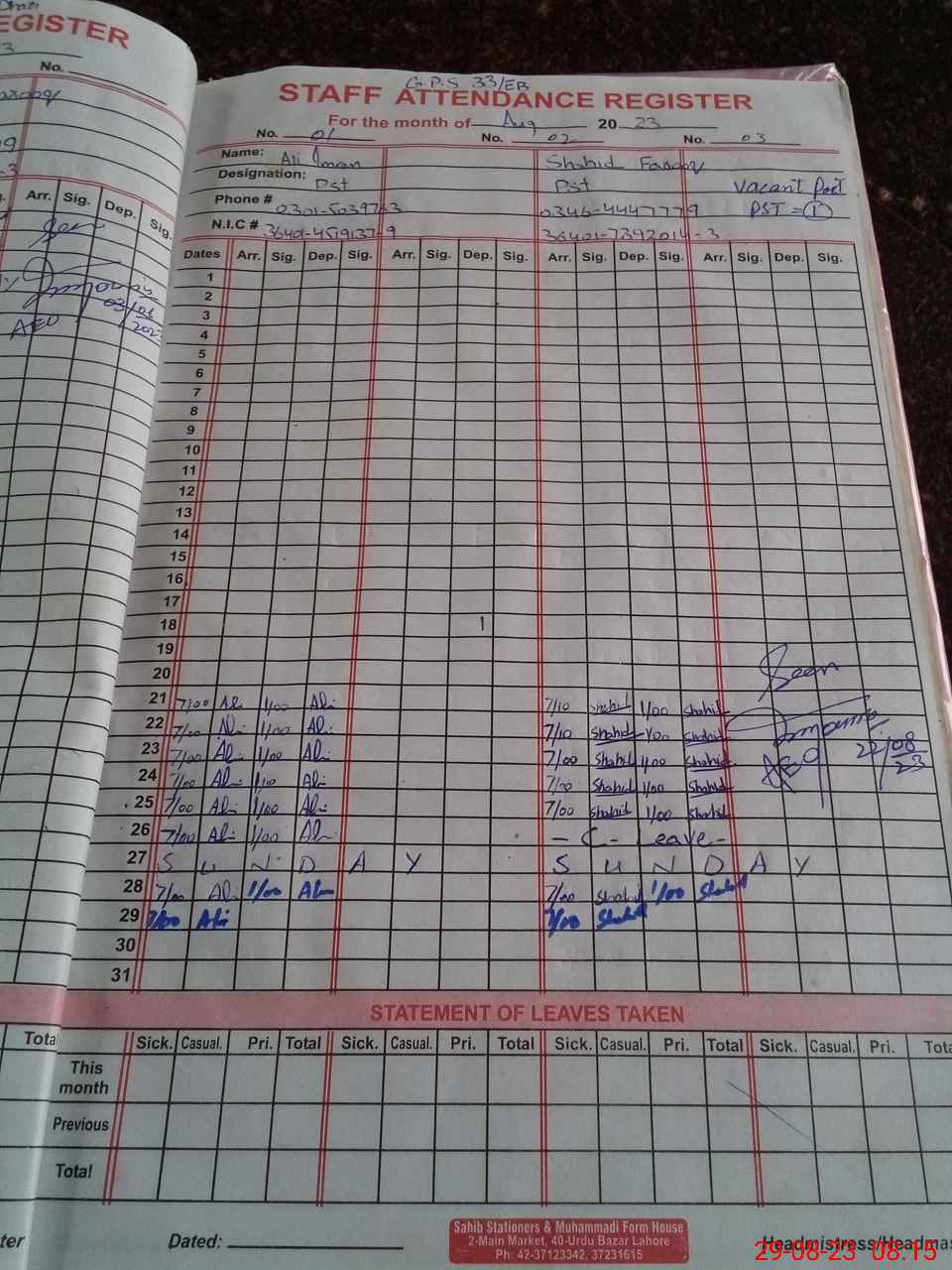| Name: AL**** IM**** Designation: (School Headmaster's/Headmistress's) PST Phone/Cell Number: 03**** |