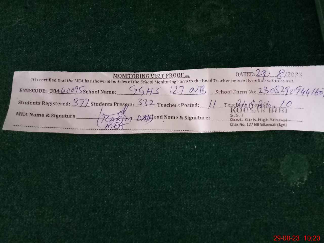 | EMIS Code: 38440095 | Name of School: GGHS CHAK NO. 127 NB | |||