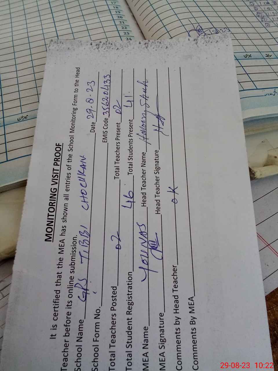 | Attendance Register | Head Teacher | MEA with School | Visit Proof |