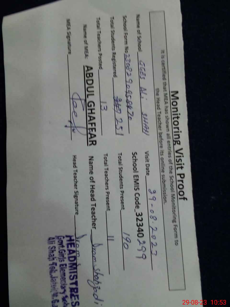 | Name: Ir**** Sh**** Designation: (School Headmaster's/Headmistress's) S.S. E Phone/Cell Number: 03**** |