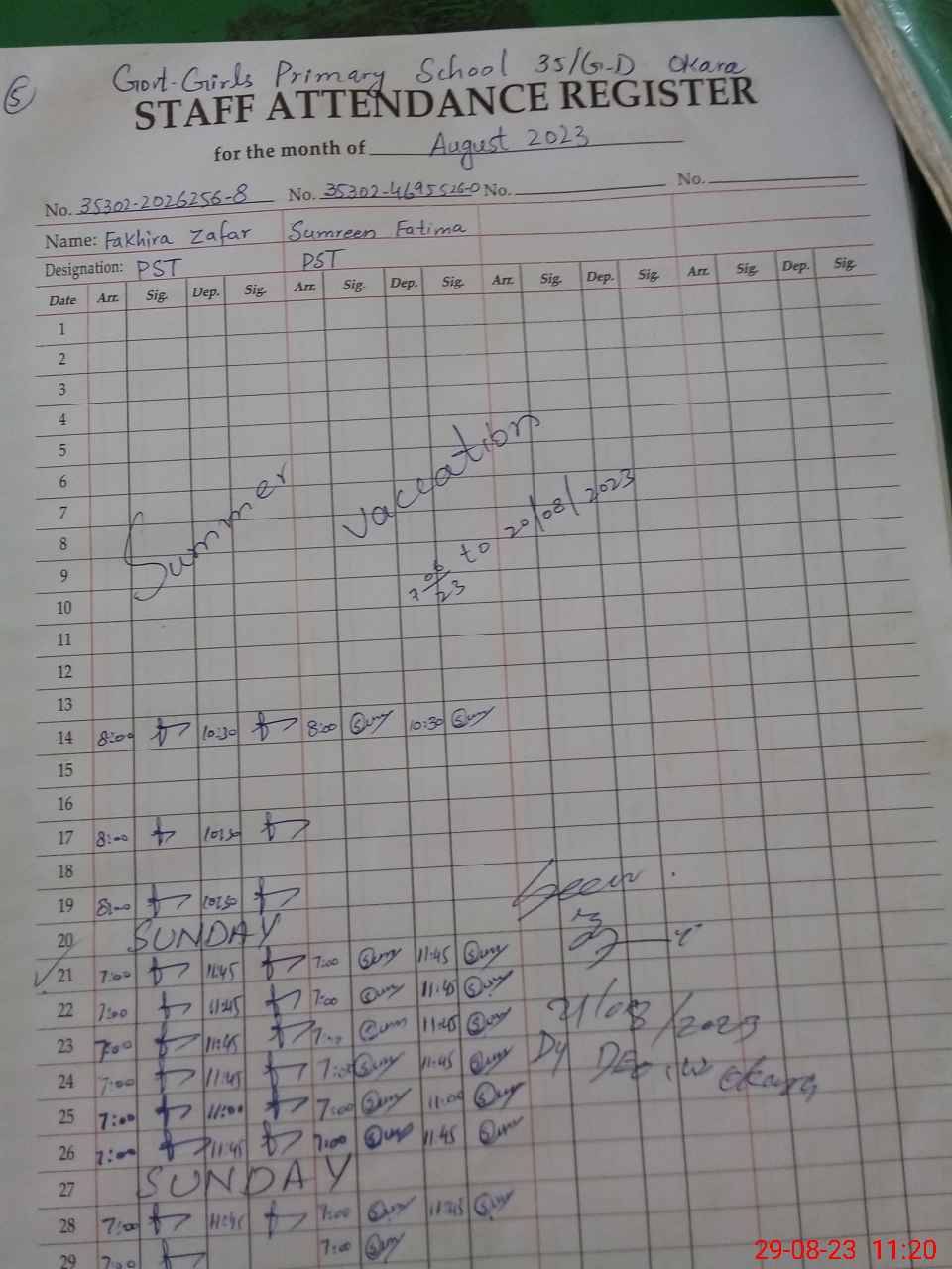 | CNIC | Full Name | Designation | R/C | Absence During Last Calender Month |