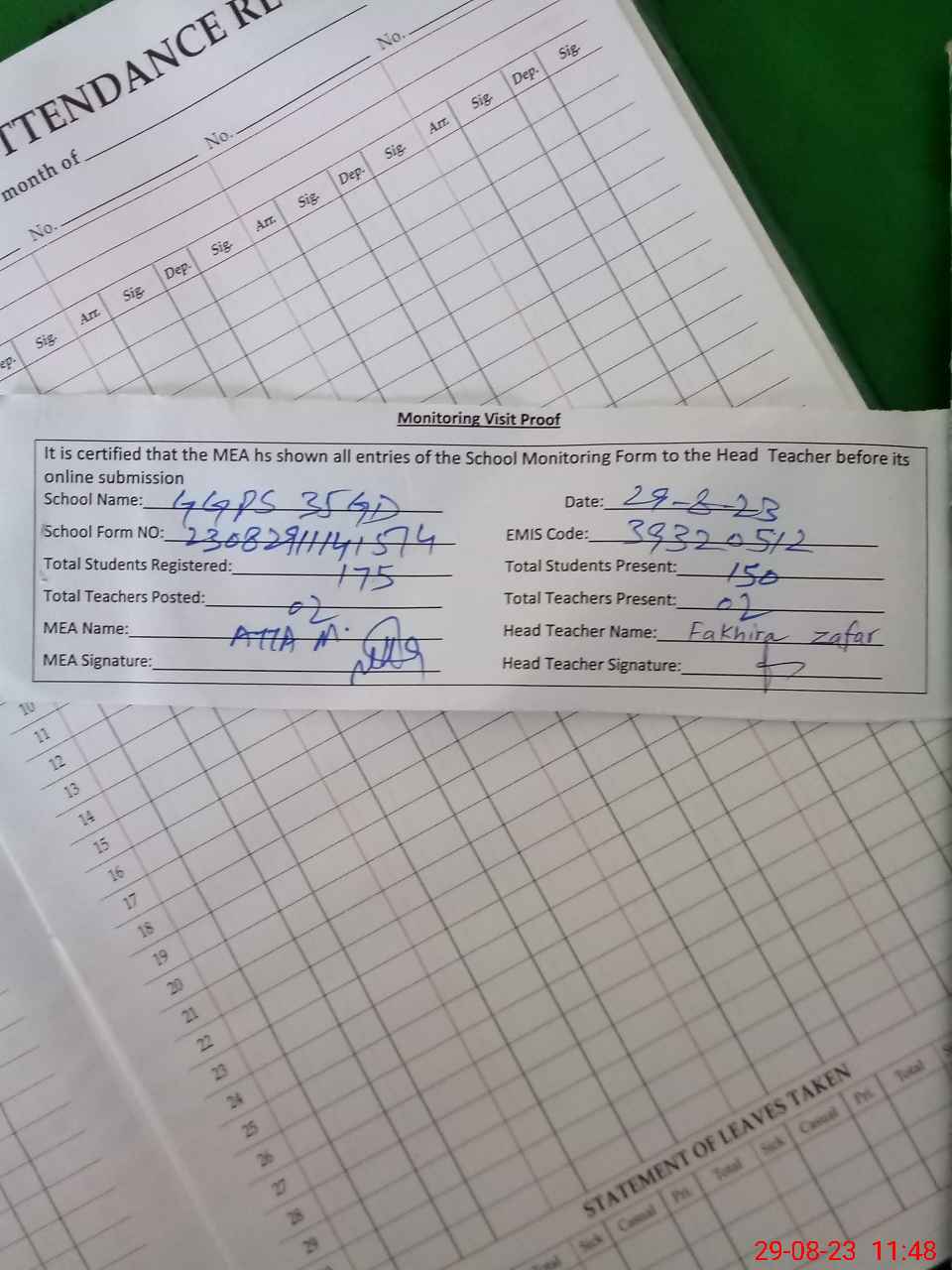 | Attendance Register | Head Teacher | MEA with School | Visit Proof |