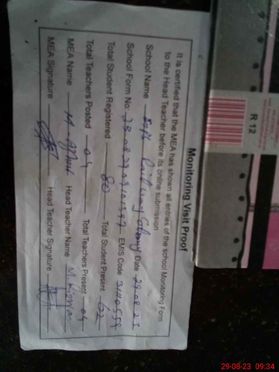 | Attendance Register | Head Teacher | MEA with School | Visit Proof |