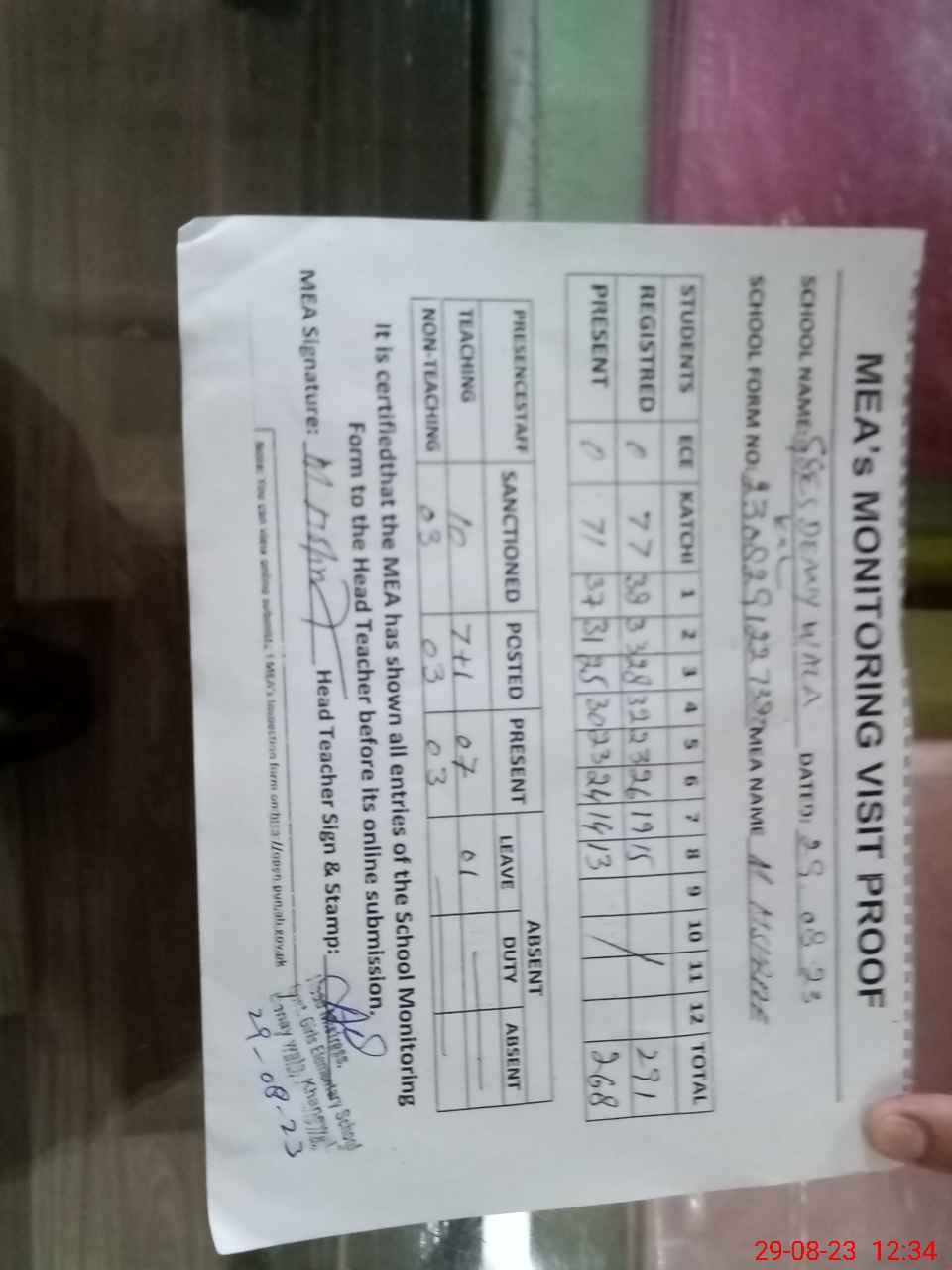 | Attendance Register | Head Teacher | MEA with School | Visit Proof |