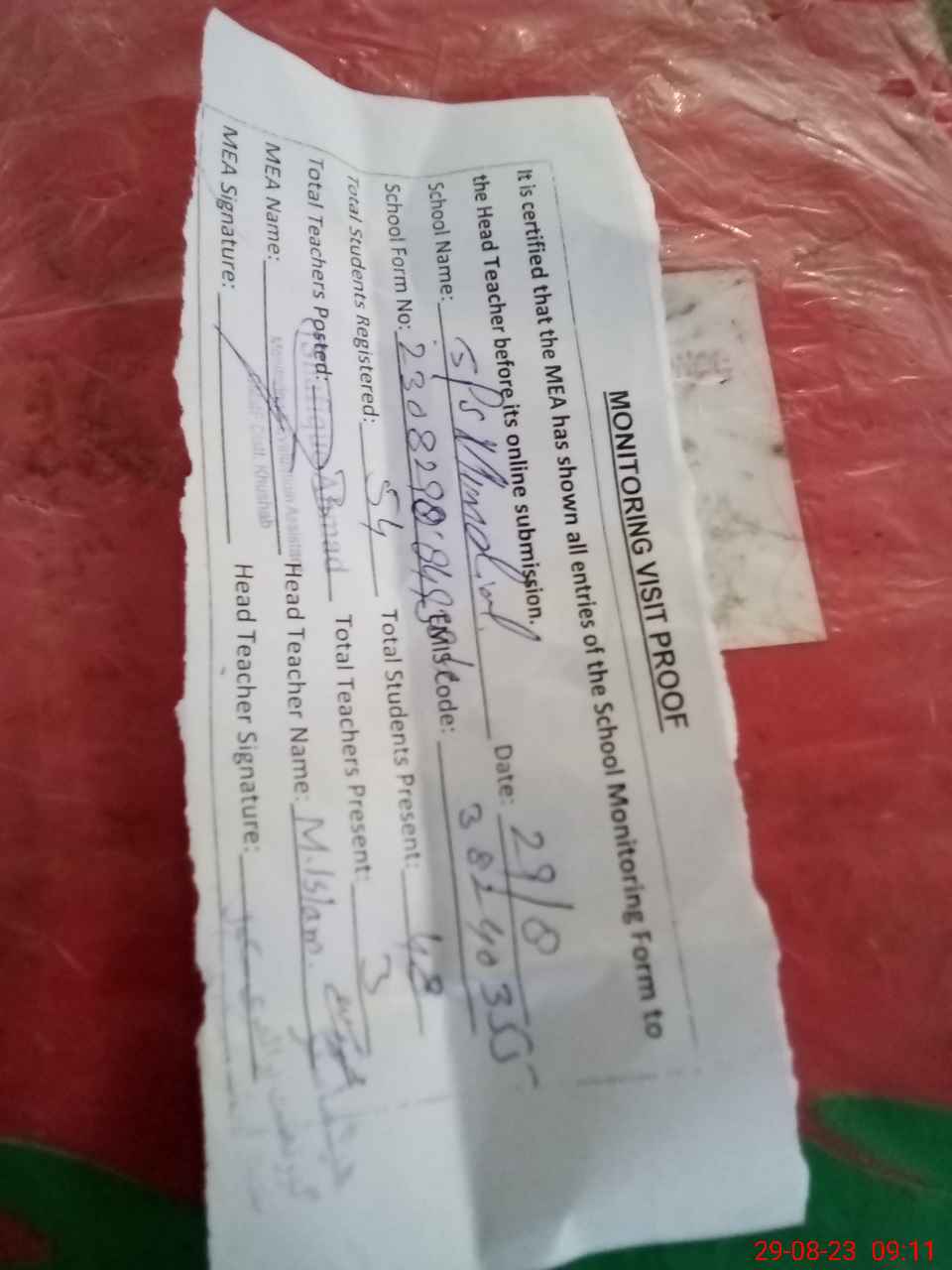 | Attendance Register | Head Teacher | MEA with School | Visit Proof |