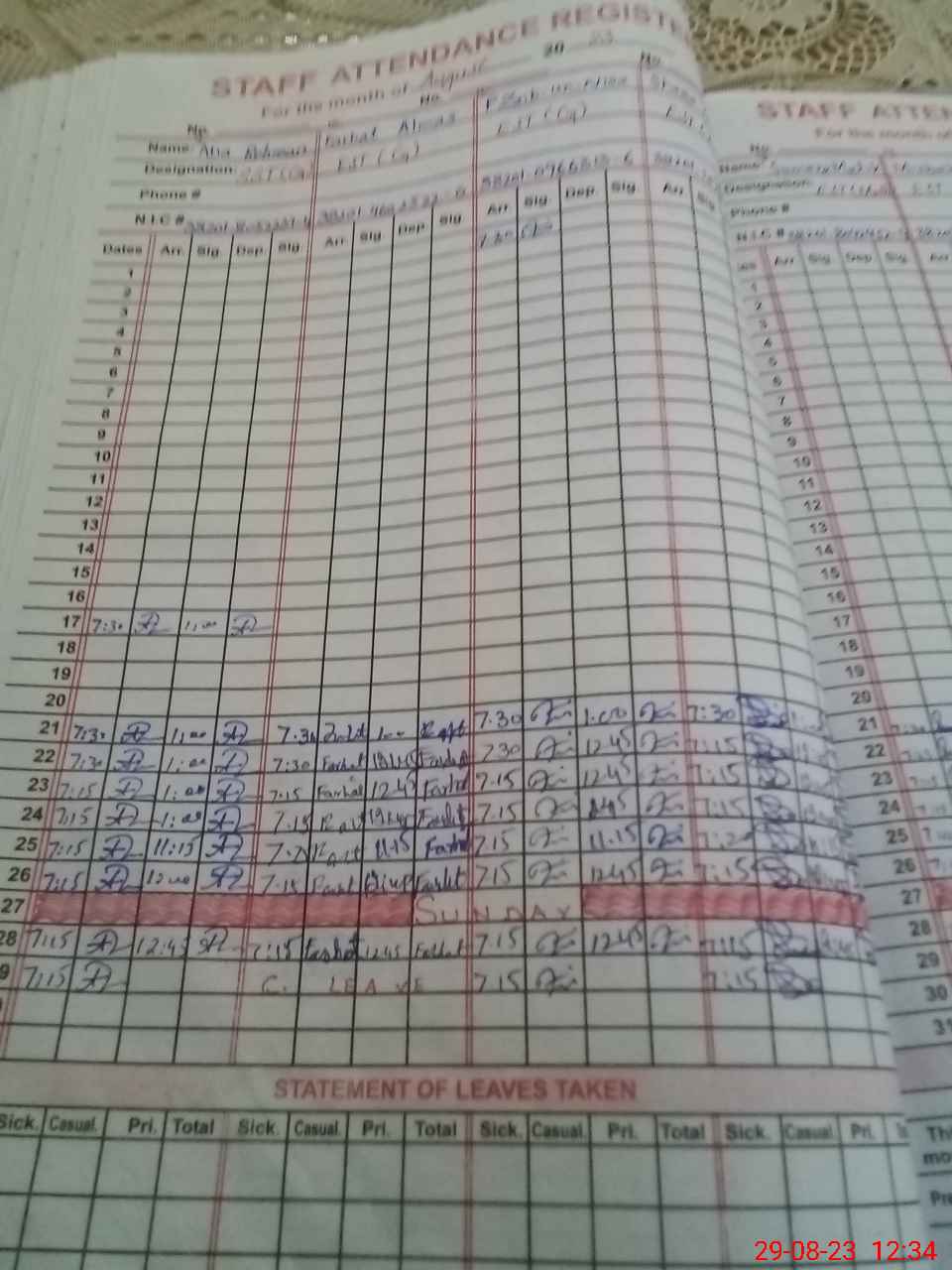 | CNIC | Full Name | Designation | R/C | Absence During Last Calender Month |