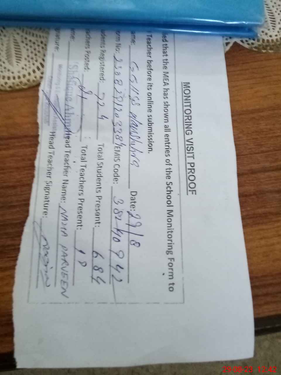| Attendance Register | Head Teacher | MEA with School | Visit Proof |
