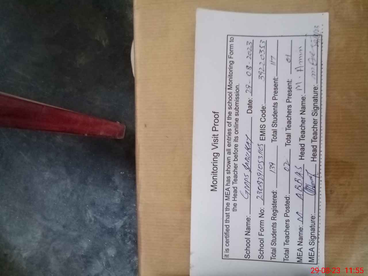 | Attendance Register | Head Teacher | MEA with School | Visit Proof |