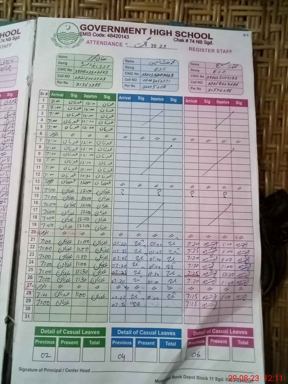 | CNIC | Full Name | Designation | R/C | Absence during last cal. month |