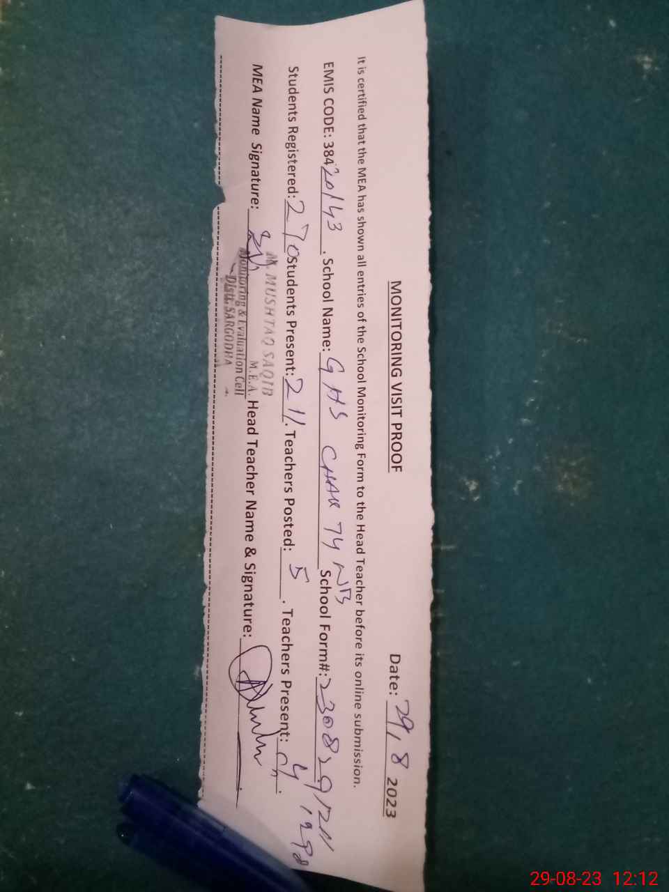 | Attendance Register | Head Teacher | MEA with School | Visit Proof |