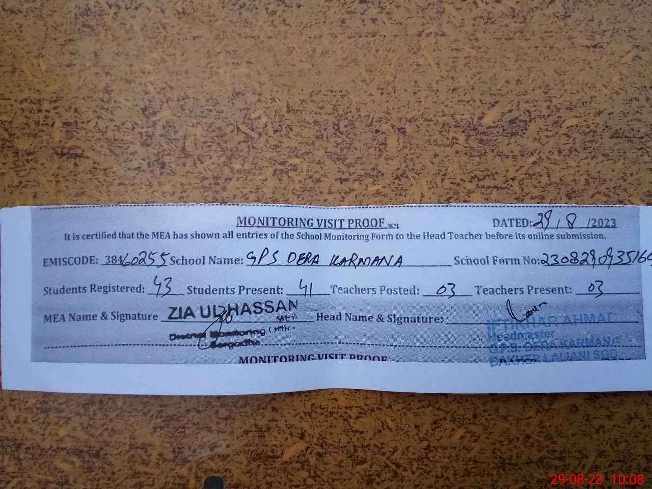 | Attendance Register | Head Teacher | MEA with School | Visit Proof |