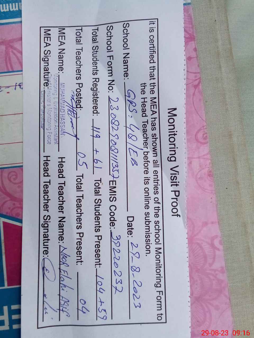 | EMIS Code: 39220237 | Name of School: GPS 48 EB P.O 50 EB ARIF WALA | |||