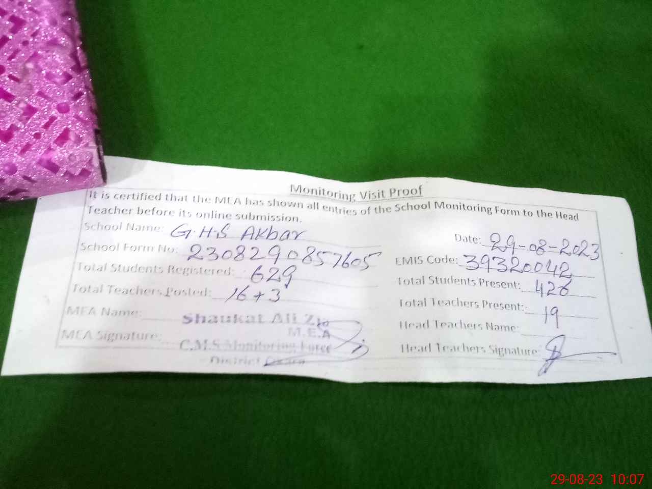 | Monitoring Date: 29-08-2023 | Start Time: 29-08-2023 08:56 AM | End Time: 29-08-2023 10:08 AM | Name of MEA: SH**** AL**** ZI**** (R**** | |