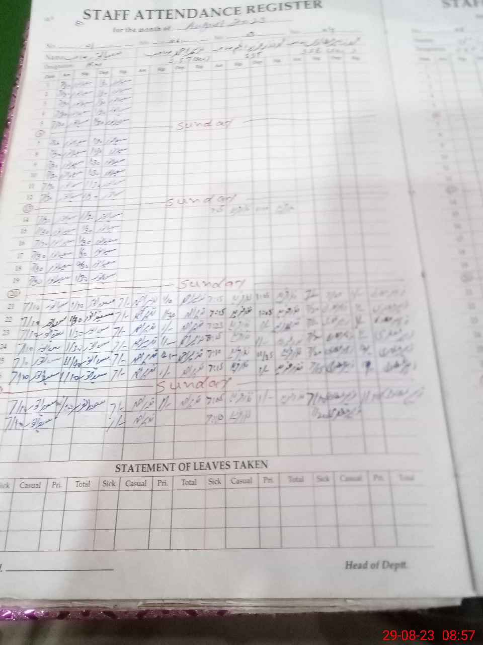 | CNIC | Full Name | Designation | R/C | Absence During Last Calender Month |