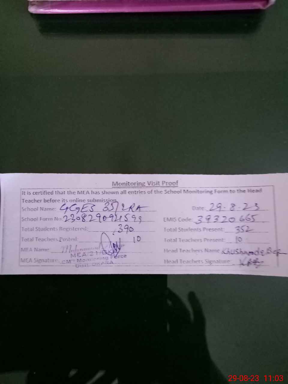 | Attendance Register | Head Teacher | MEA with School | Visit Proof |
