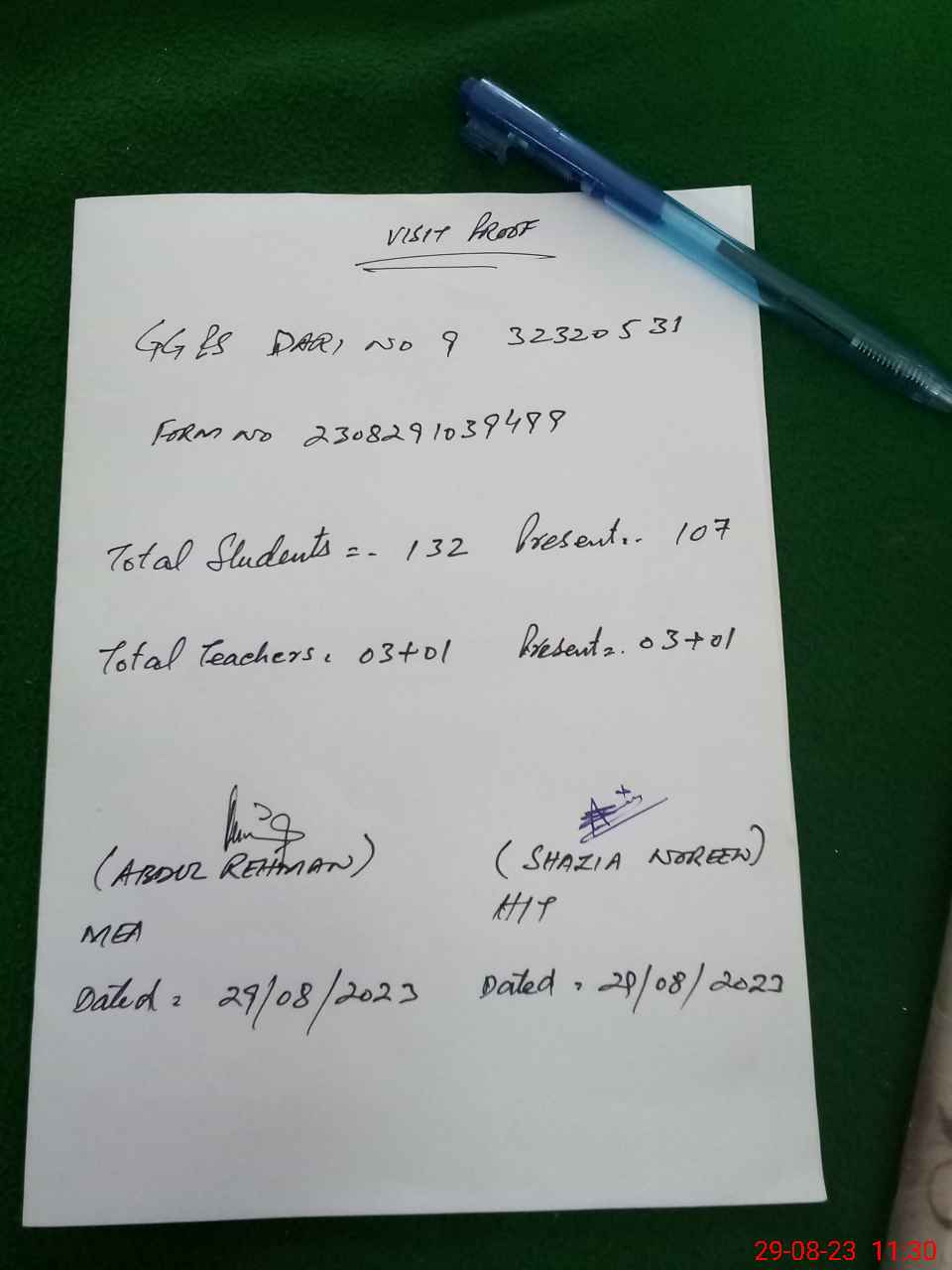 | Attendance Register | Head Teacher | MEA with School | Visit Proof |