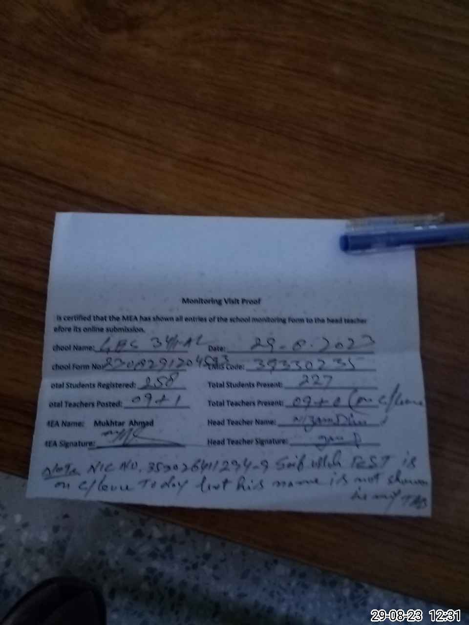 | Attendance Register | Head Teacher | MEA with School | Visit Proof |