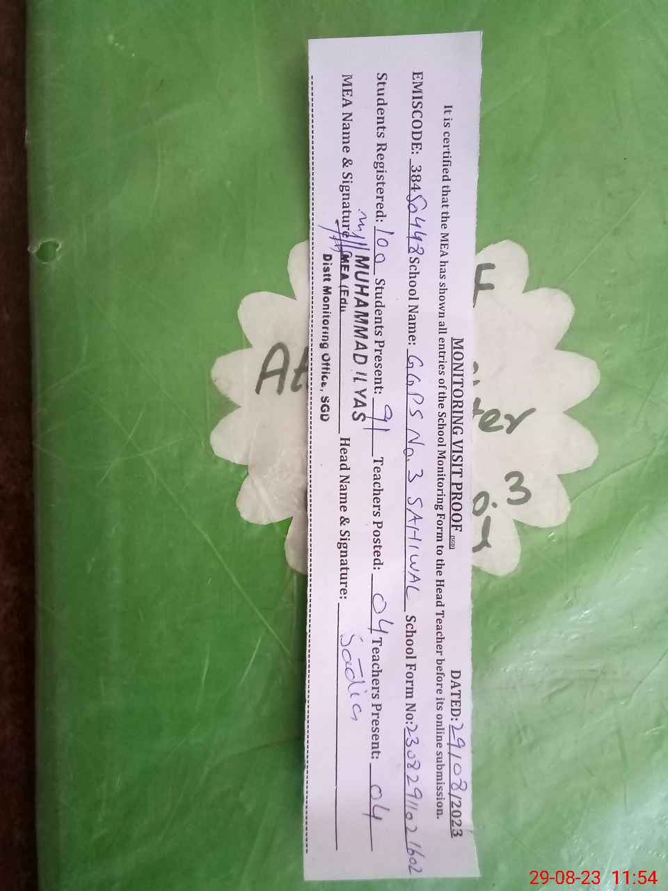 | Attendance Register | Head Teacher | MEA with School | Visit Proof |