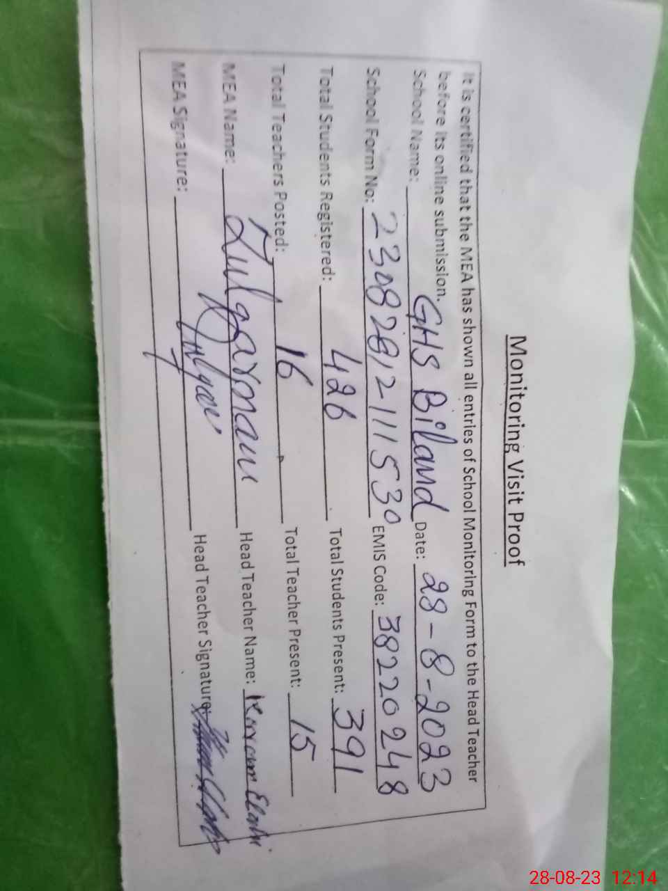 | Attendance Register | Head Teacher | MEA with School | Visit Proof |