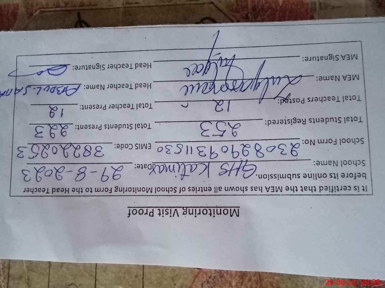 | Attendance Register | Head Teacher | MEA with School | Visit Proof |