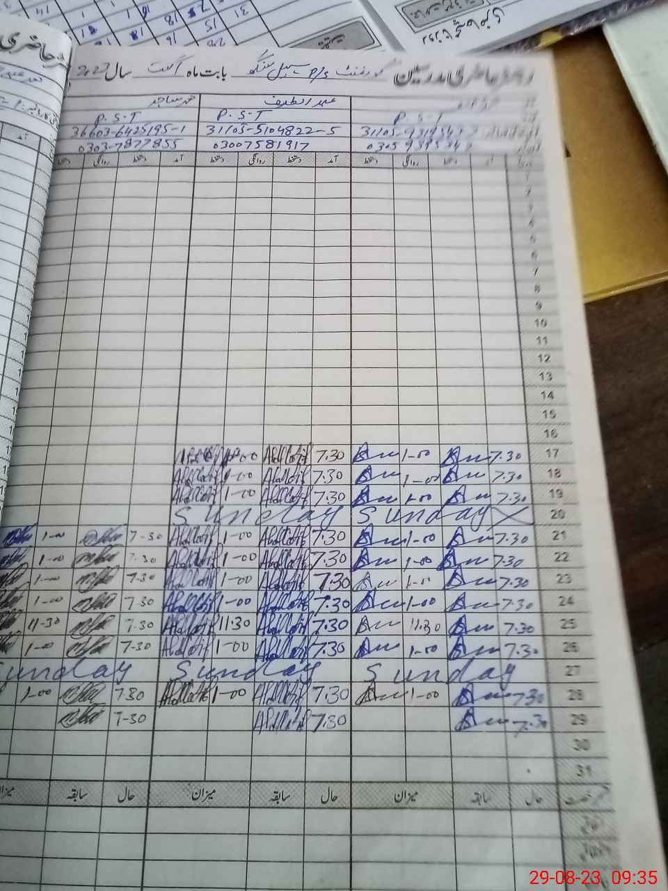 | CNIC | Full Name | Designation | R/C | Absence during last cal. month |