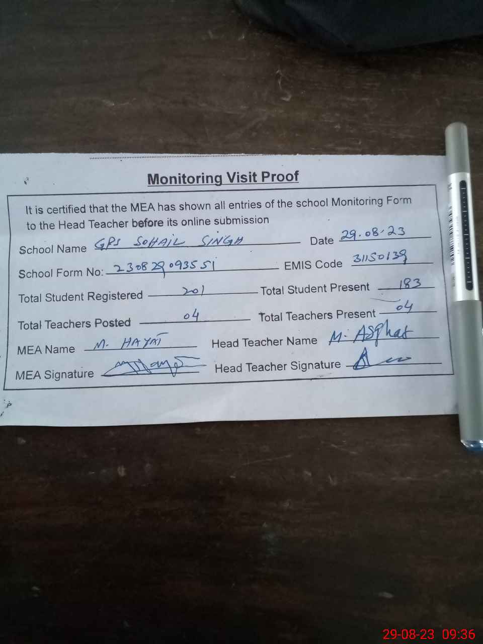 | Attendance Register | Head Teacher | MEA with School | Visit Proof |