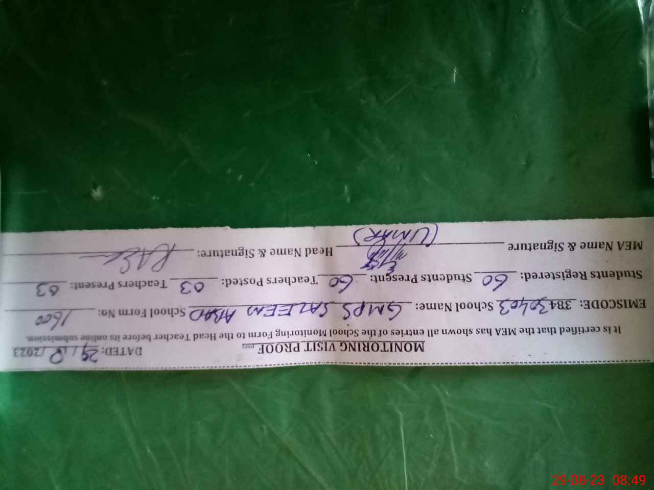 | Attendance Register | Head Teacher | MEA with School | Visit Proof |