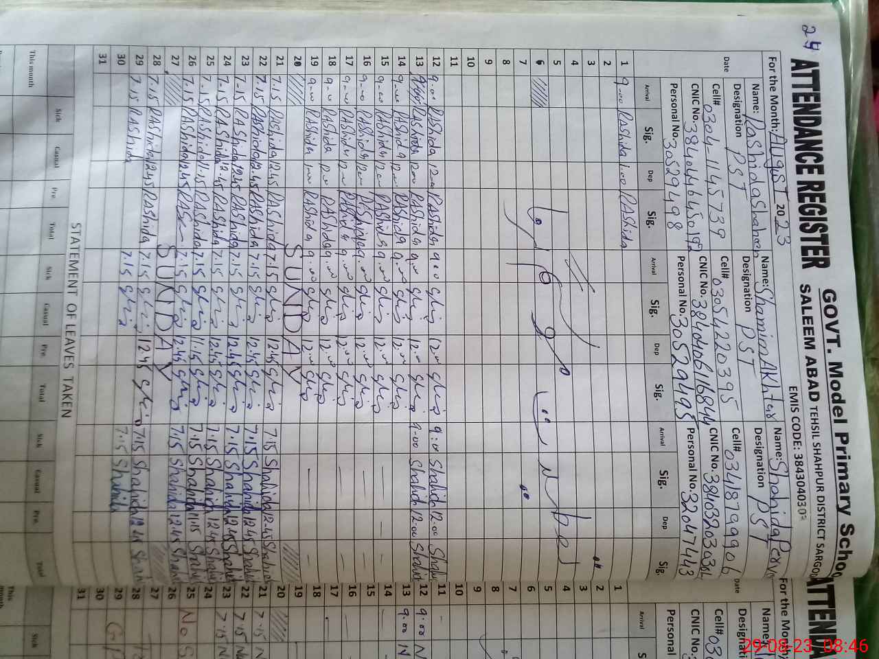 | Name: SH**** PA**** Designation: (School Headmaster's/Headmistress's) PST Phone/Cell Number: 03**** |