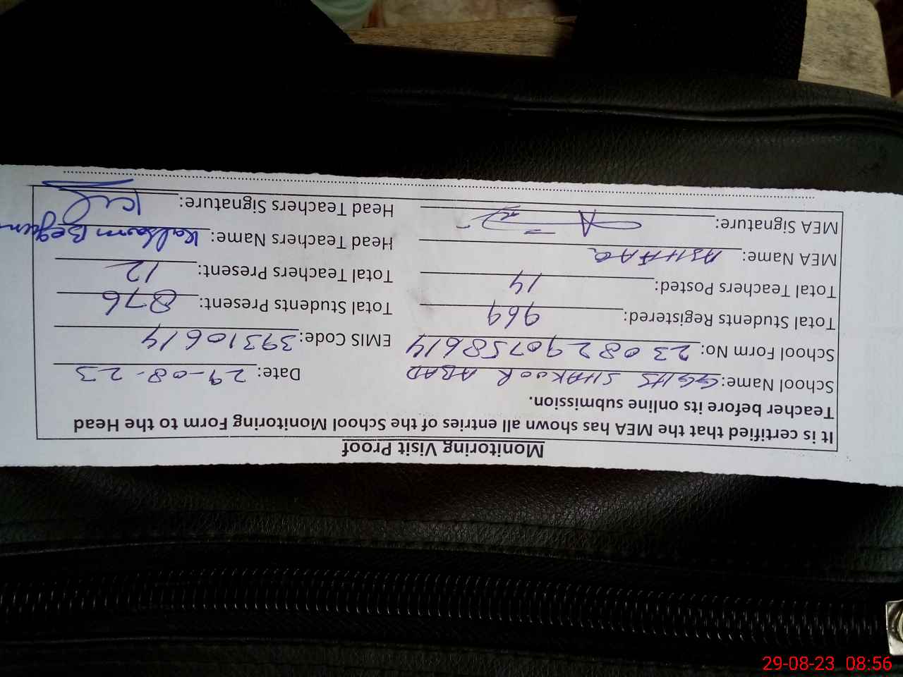 | Attendance Register | Head Teacher | MEA with School | Visit Proof |