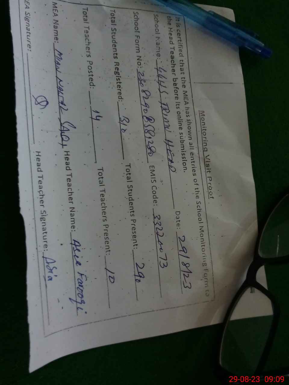 | Attendance Register | Head Teacher | MEA with School | Visit Proof |