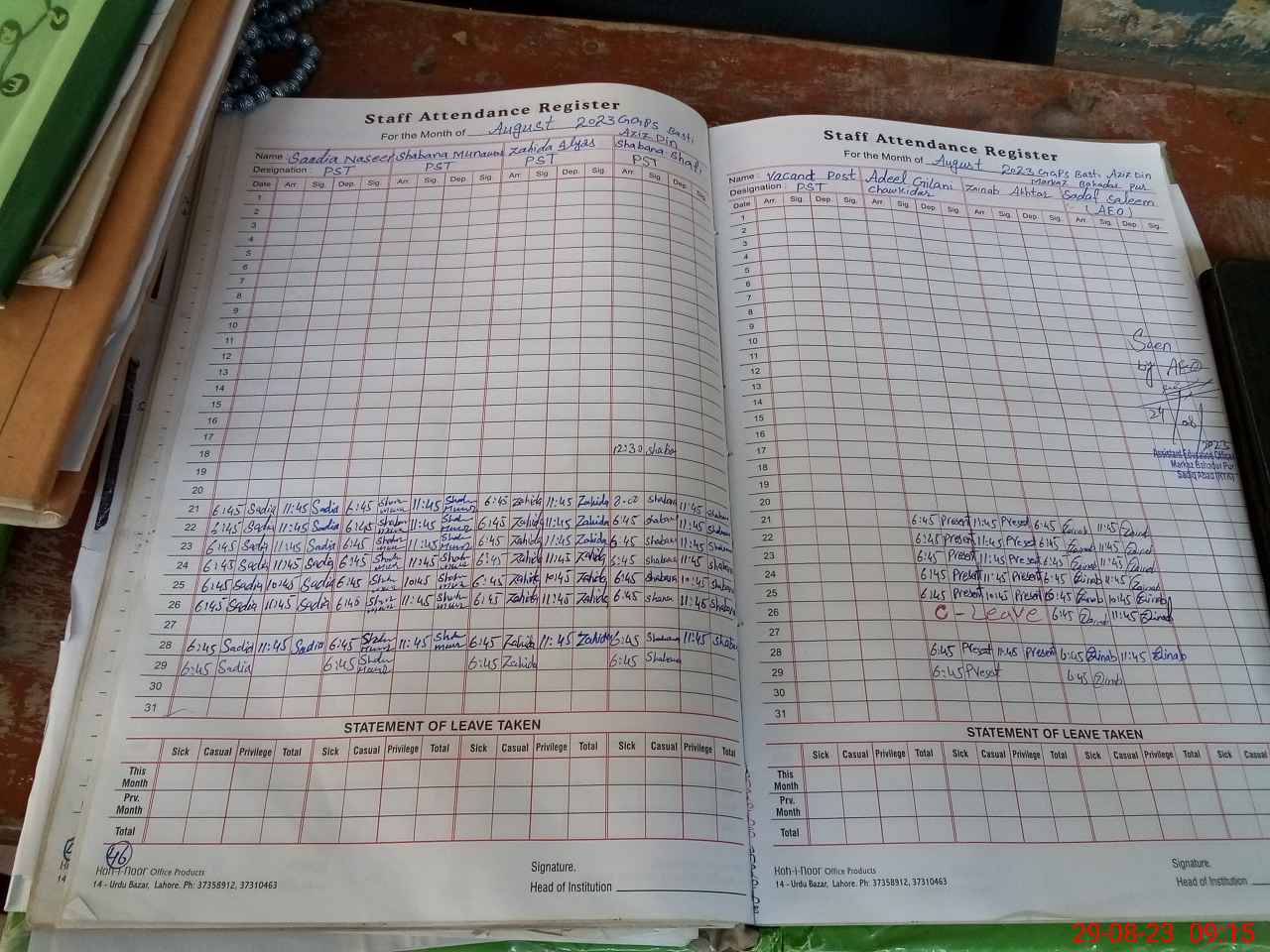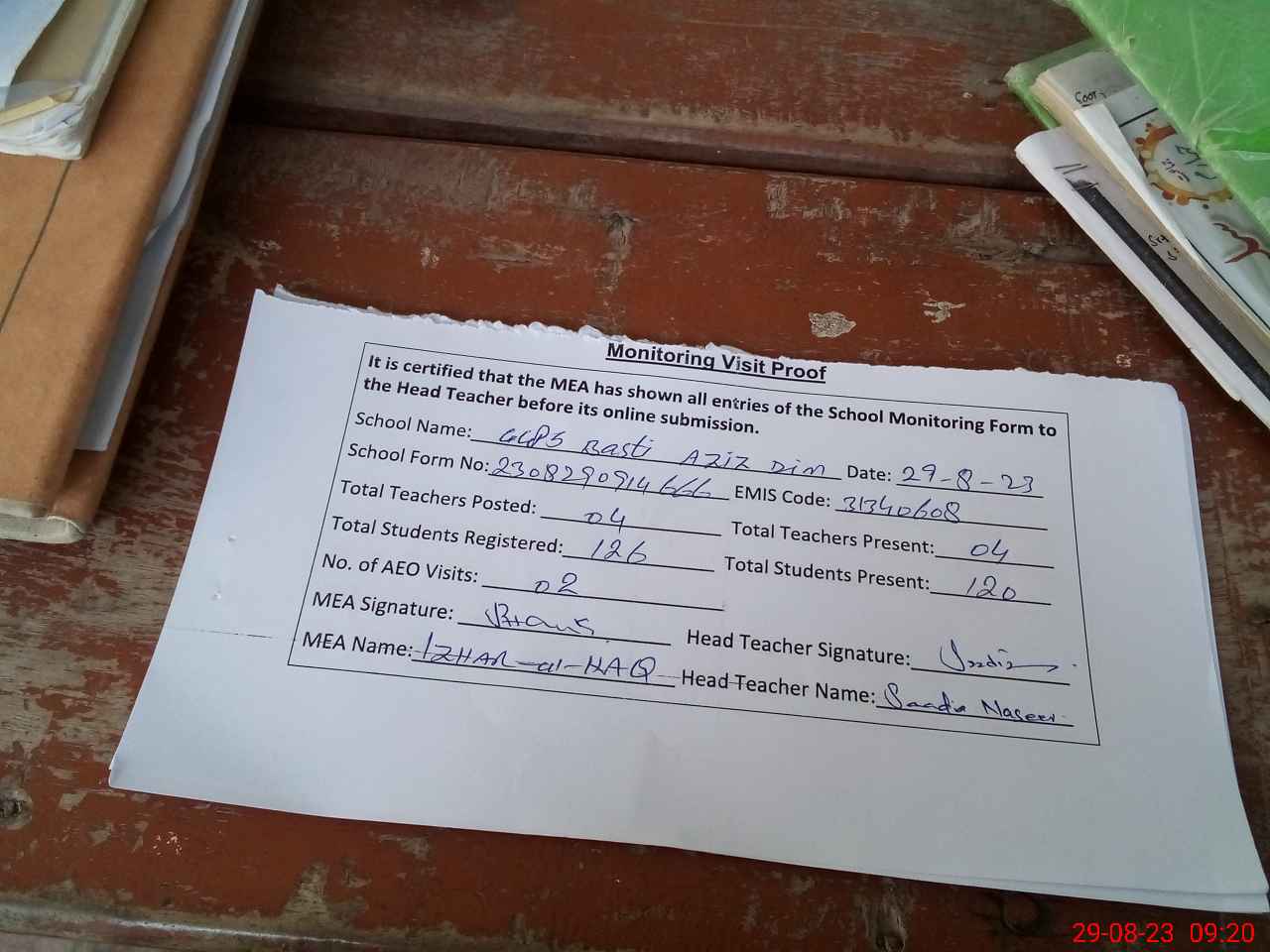| Attendance Register | Head Teacher | MEA with School | Visit Proof |