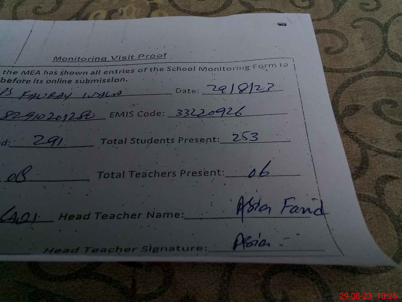 | Name: As**** Fa**** Designation: (School Headmaster's/Headmistress's) ESE Phone/Cell Number: 03**** |