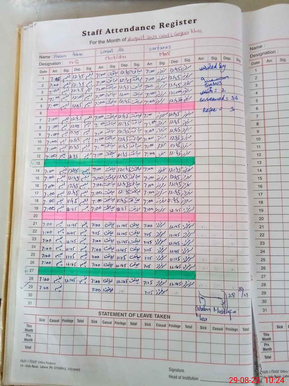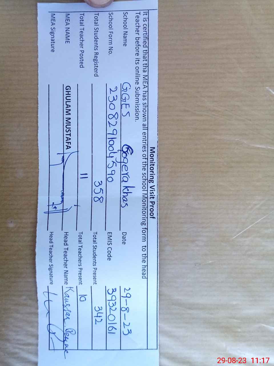 | Attendance Register | Head Teacher | MEA with School | Visit Proof |