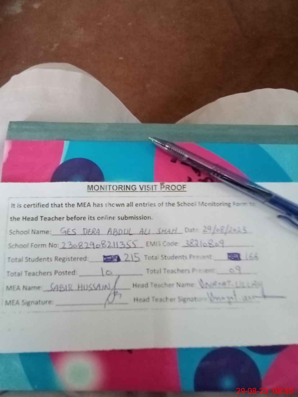 | EMIS Code: 38210809 | Name of School: GES DERA ABDUL ALI SHAH MOHIB PUR | |||