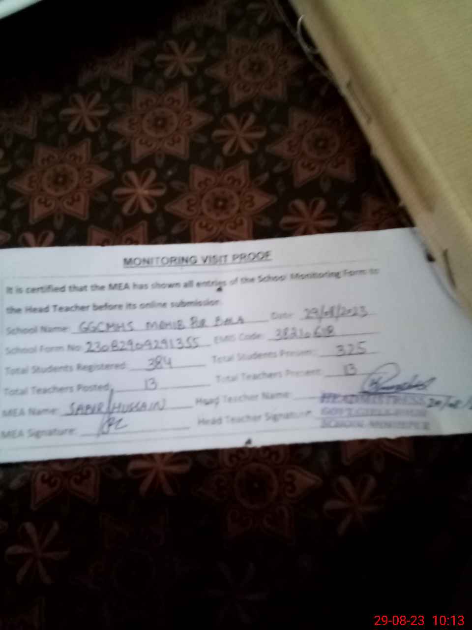 | Certified that this School was Inspected by the Undersigned MEA/DMO Today and the Information Stated Above is as Per Record. | |||||