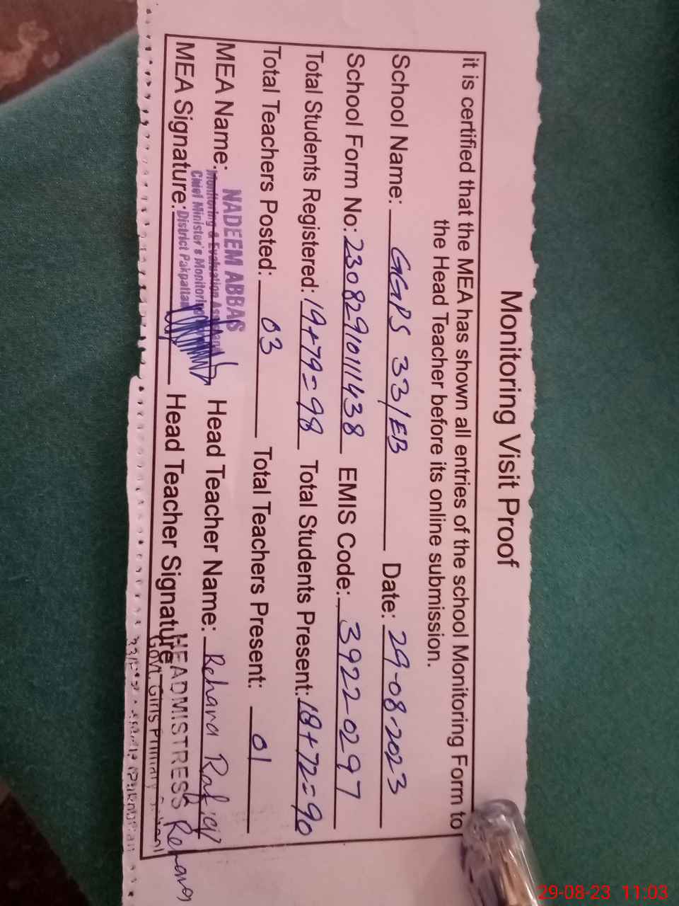 | EMIS Code: 39220297 | Name of School: GGPS 33 EB | |||