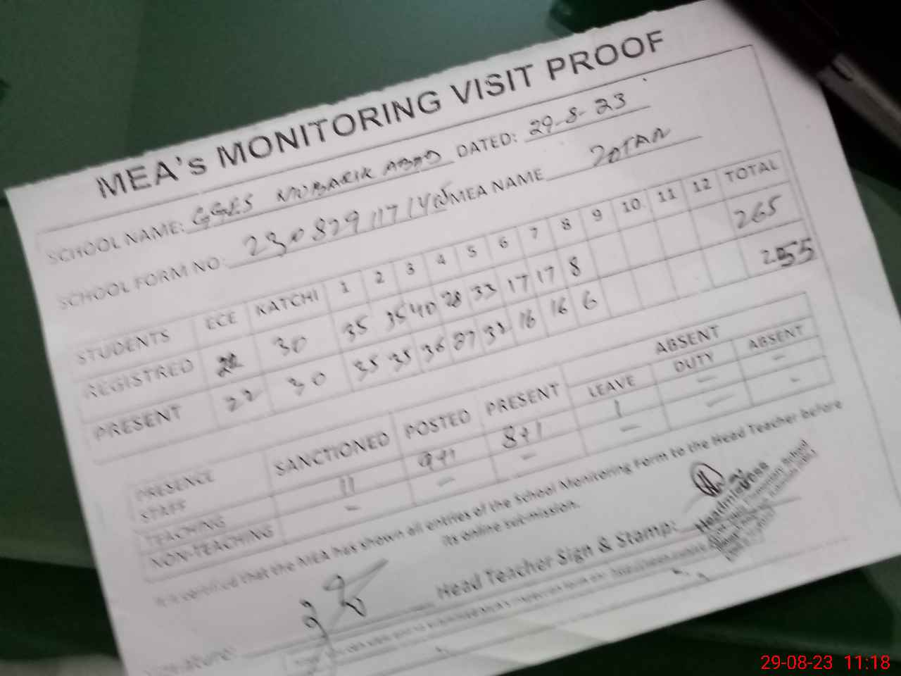 | Attendance Register | Head Teacher | MEA with School | Visit Proof |