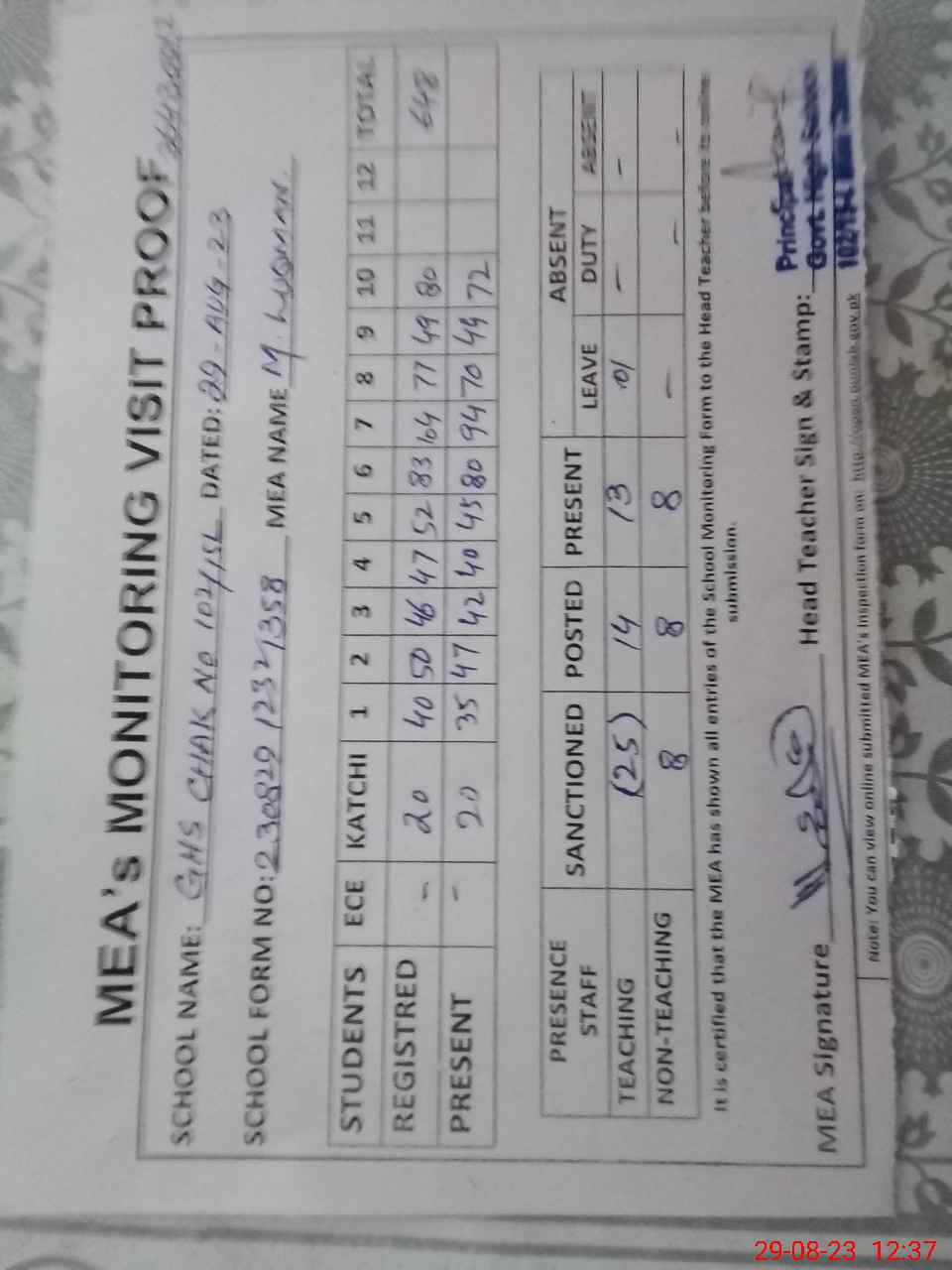 | Attendance Register | Head Teacher | MEA with School | Visit Proof |