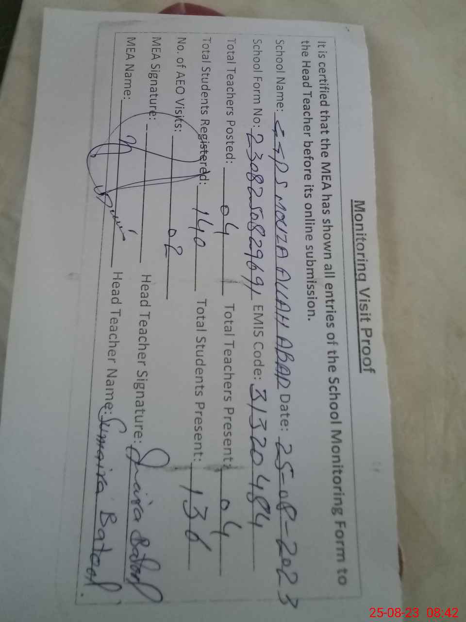 | Attendance Register | Head Teacher | MEA with School | Visit Proof |