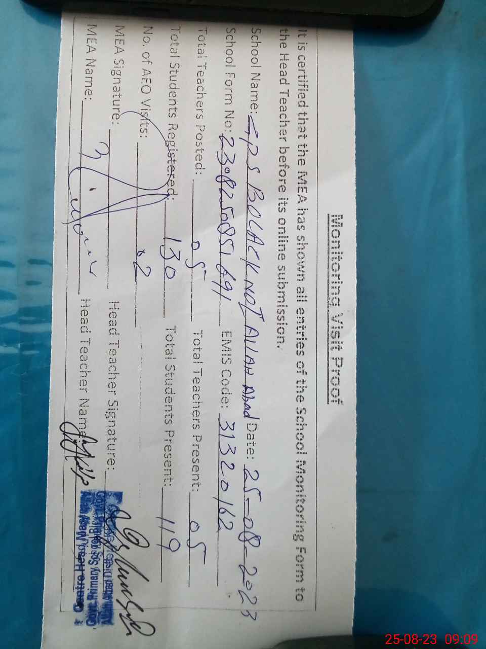 | Attendance Register | Head Teacher | MEA with School | Visit Proof |