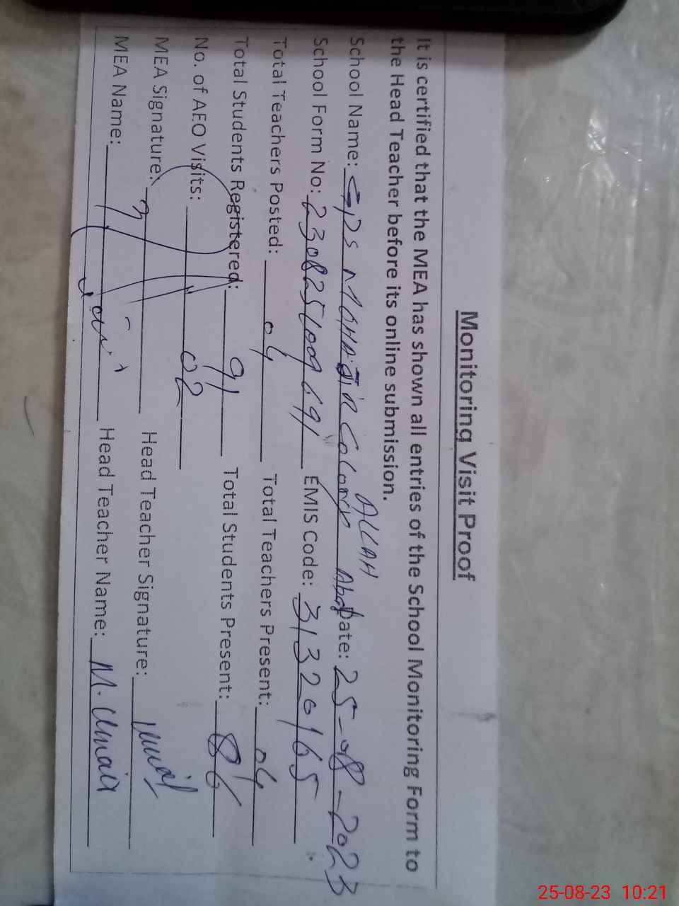 | Attendance Register | Head Teacher | MEA with School | Visit Proof |