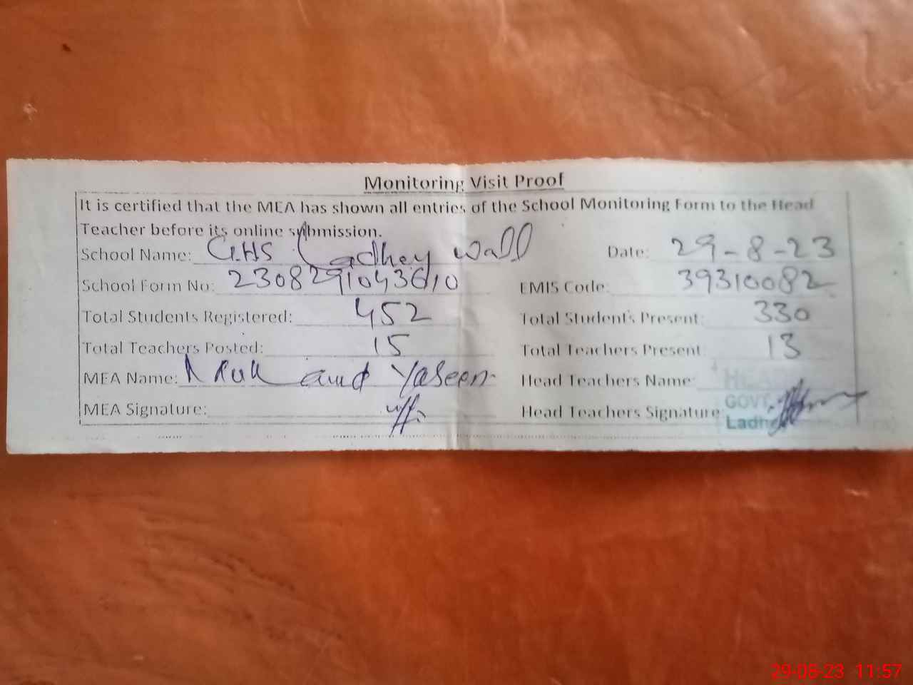 | EMIS Code: 39310082 | Name of School: GHS LADHEY WAL | |||