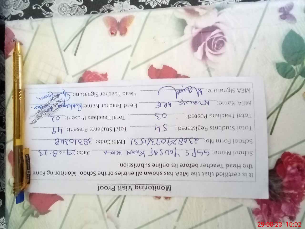 | Attendance Register | Head Teacher | MEA with School | Visit Proof |