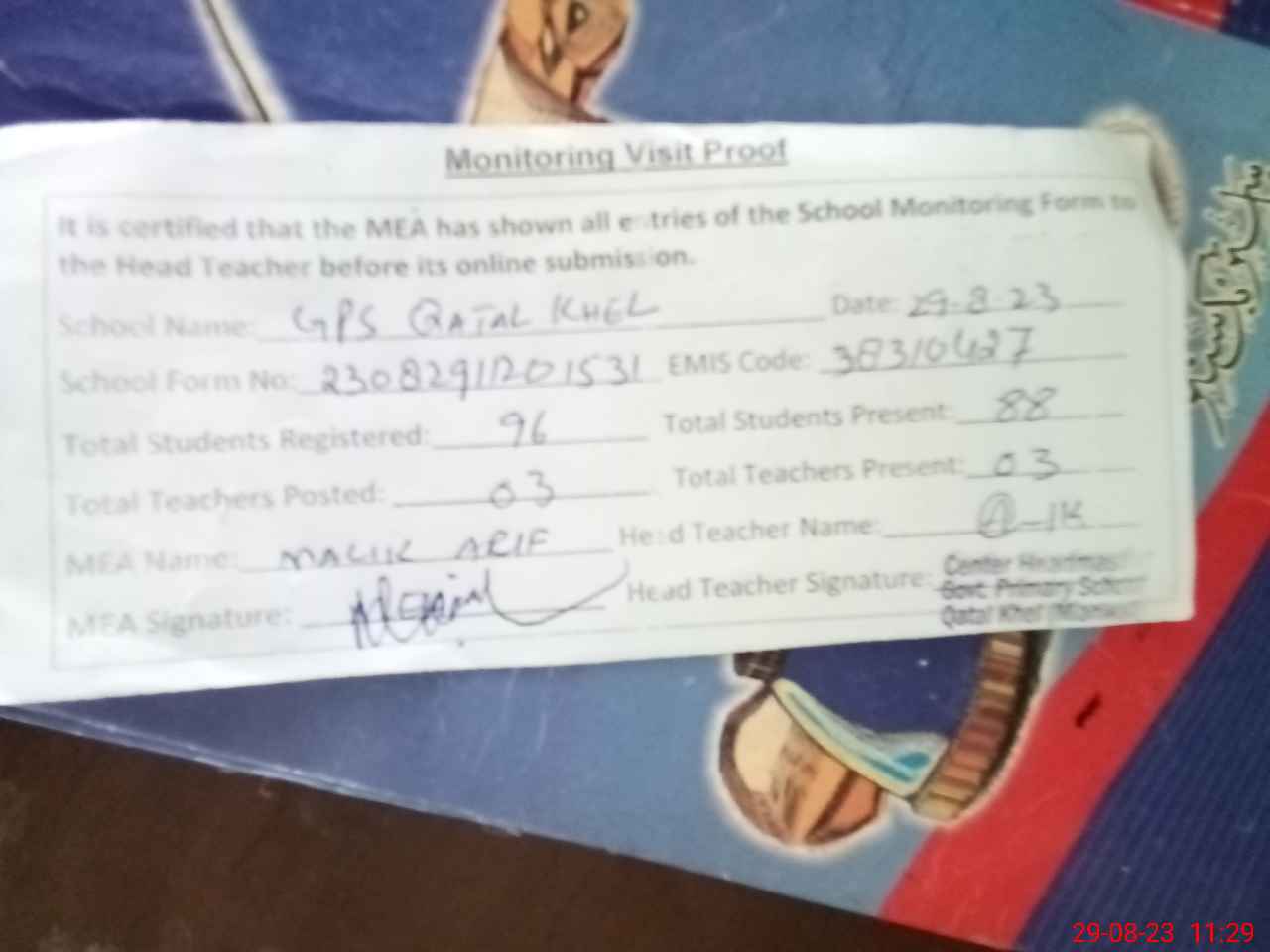 | Attendance Register | Head Teacher | MEA with School | Visit Proof |