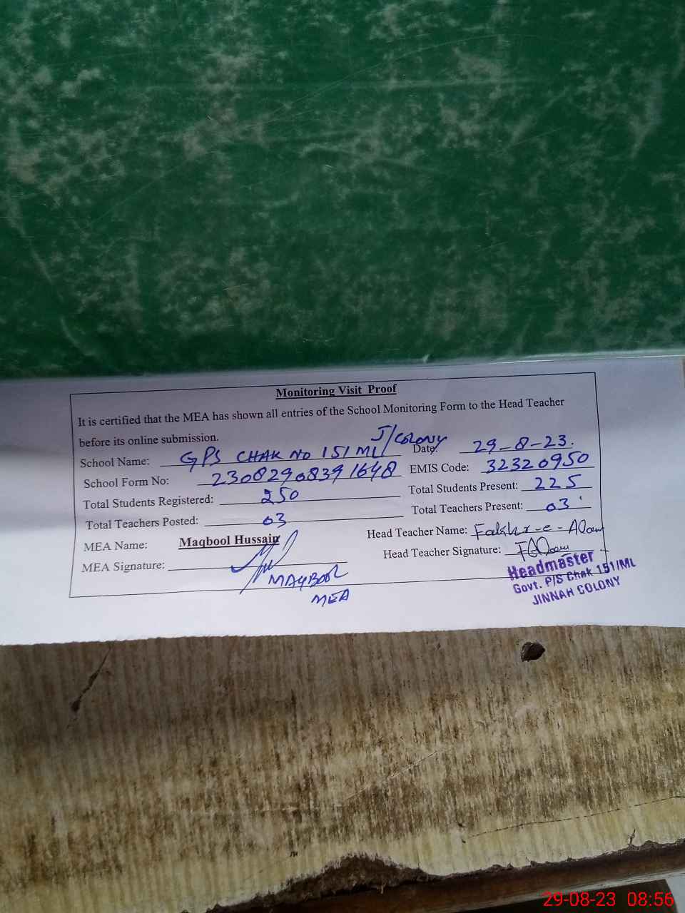 | EMIS Code: 32320950 | Name of School: GPS CHAK NO. 151 ML (JINNAH COLONY) | |||