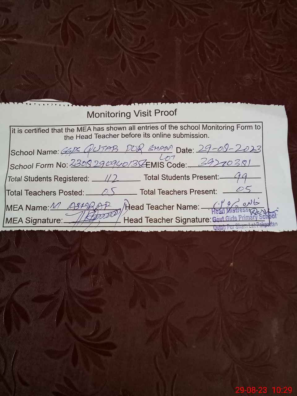 | EMIS Code: 39210381 | Name of School: GGPS QUTAB PUR SHAM LAT | |||